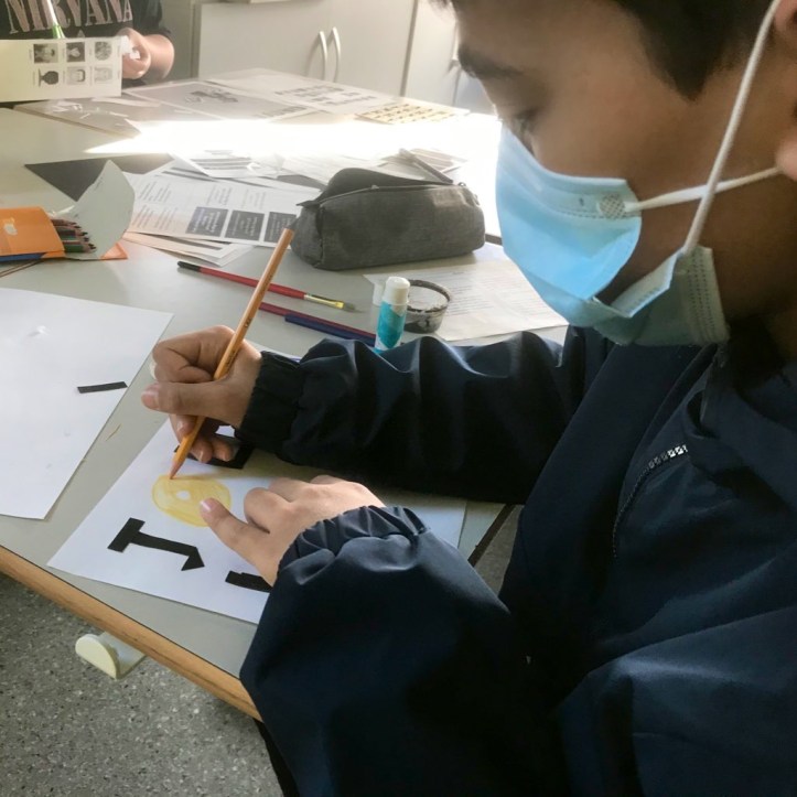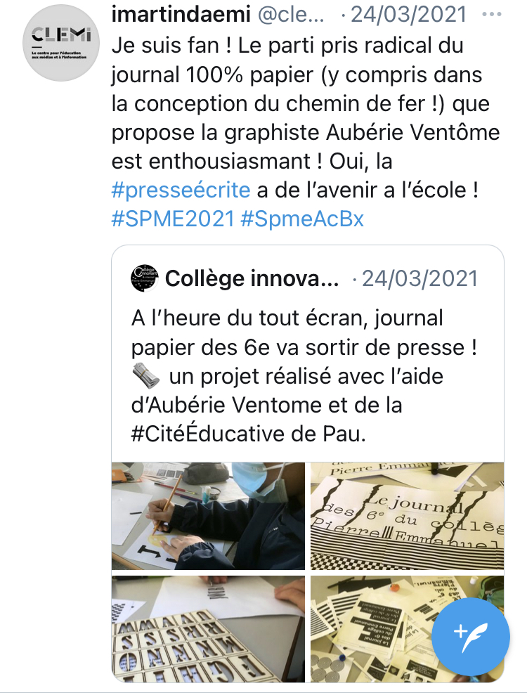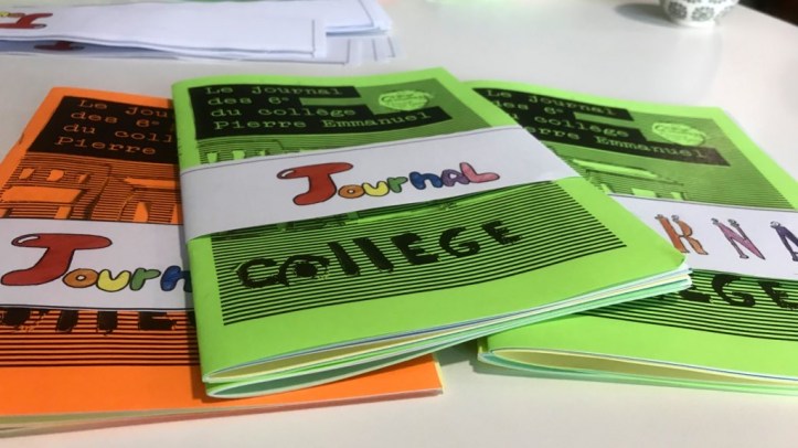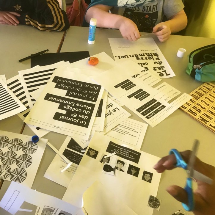 C’est en sixième que le projet était le plus étendu, chaque classe a travaillé pendant 8 heures à la réalisation d’un journal papier avec la graphiste Aubérie Vantomme. Nous avons choisi de ne pas utiliser de support numérique pour nos jeunes élèves afin de leur permettre de manipuler et de fabriquer un journal tout en papier, eux qui ont sans doute le moins l’habitude de ce support. Ciseaux, colle, papier, encre, tampons… ils ont créé de toutes pièces un média qui leur ressemble ! Ce fut l’occasion de travailler sur la notion de source de l’information et de se demander ce qui avait sa place ou non dans ce journal. Mme Chabasse, professeur de français de ces deux classes a eu l’idée d’envoyer une copie de chaque réalisation aux anciens professeur(e)s des écoles de CM2 de ces élèves de sixième… une manière de donner des nouvelles.