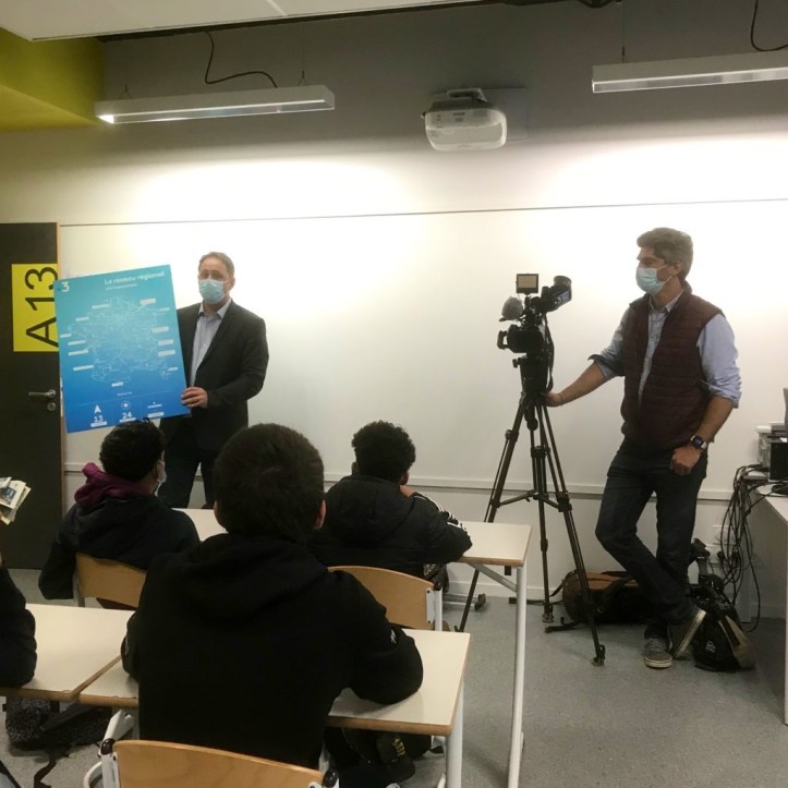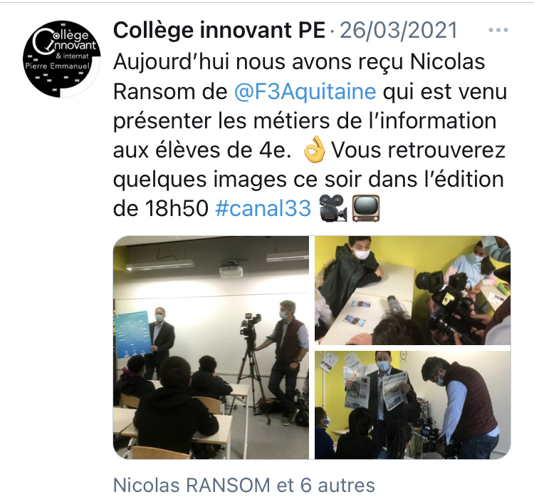 Enfin nous avons eu la chance de pouvoir faire venir Nicolas Ransom, directeur de l’antenne locale de France 3 Pau. Il est venu rencontrer les deux classes de quatrième pour parler des différents métiers de l’information. Il s’est déplacé avec un collègue journaliste et en a profité our réaliser un petit sujet pour l’édition du vendredi soir visible ci-dessous.