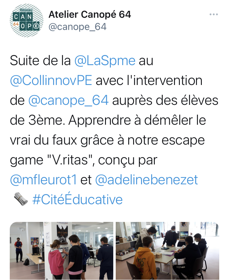 Enfin pour les élèves de troisième, le partenaire de l’Éducation nationale CANOPÉ a fait vivre un escape game numérique aux élèves. L’objectif était de développer les compétences du 21° siècle afin de développer l’émulation et l’entraide dans le cadre d’un travail collaboratif. Savoir s’exprimer, s’écouter, s’organiser, se coordonner… Cette approche ludique a permis de travailler le rapport de l’individu au groupe et vice versa, mais aussi de proposer une réflexion sur le traitement de l’information (recherche, validation, tri, traitement).
