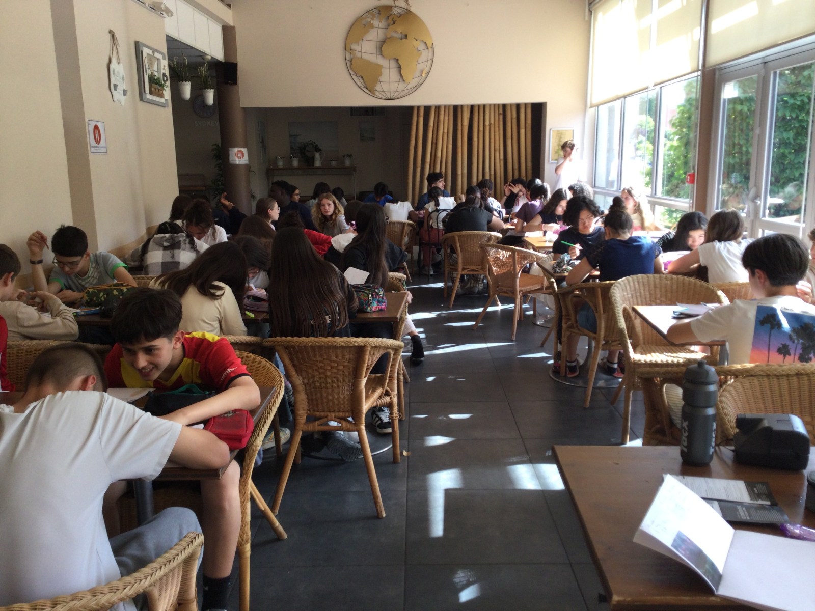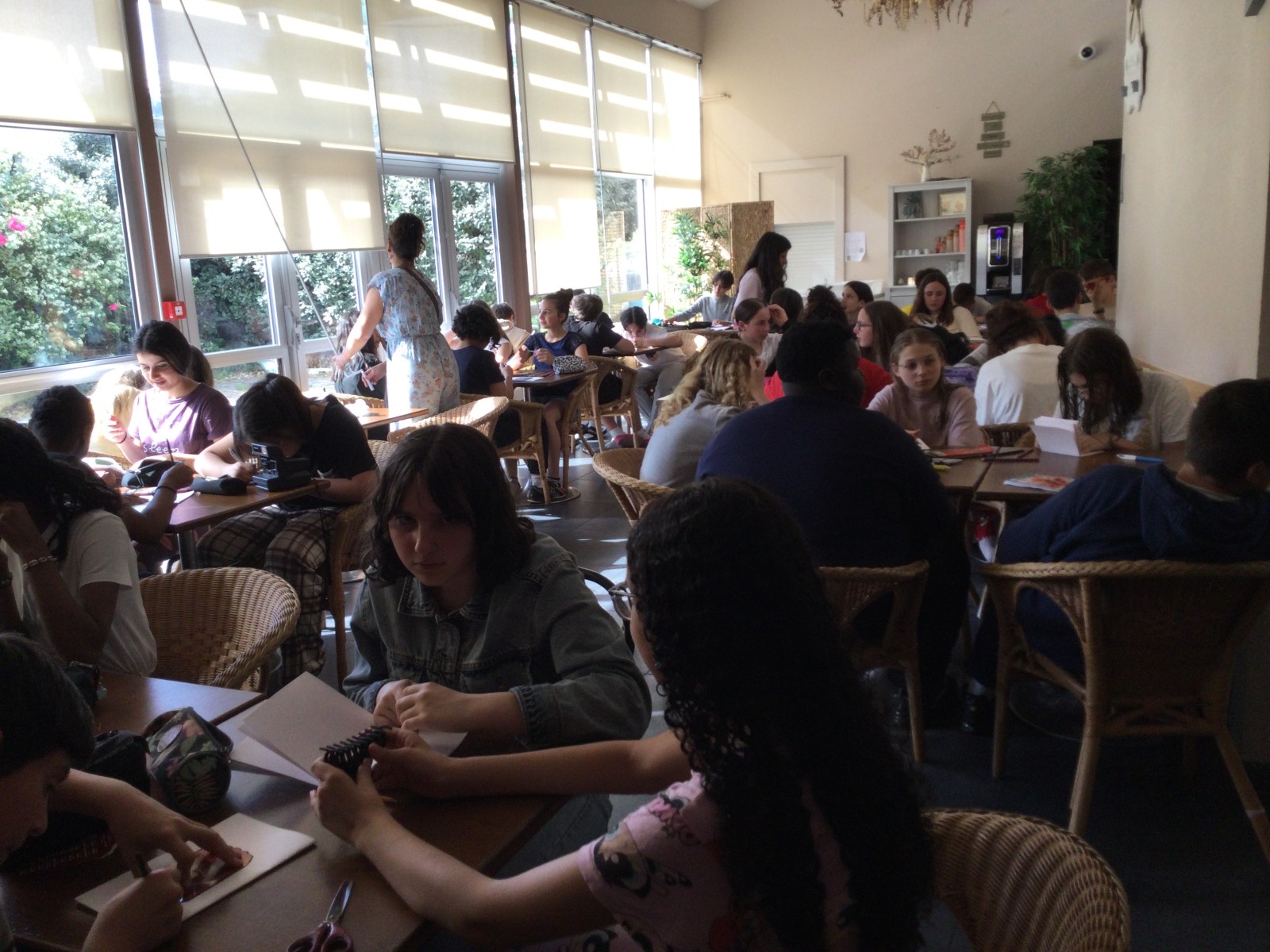 Maintenant, nous travaillons pendant 1 heure sur notre carnet de voyage de Bordeaux : ce qu’on a fait dans la journée, ce qui nous a marqué, comme aller dans le bassin des lumières. Juste avant, on s’est installés dans les chambres de 4 ou 3 ou 2.