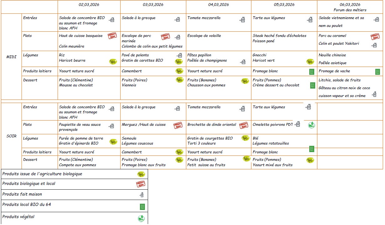 Menu du 2 au 6 mars 2026