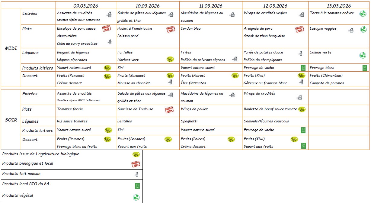 Menu du 9 au 13 mars 2026