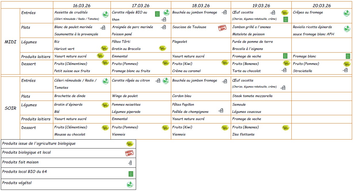 Menu du 16 au 20 mars 2026