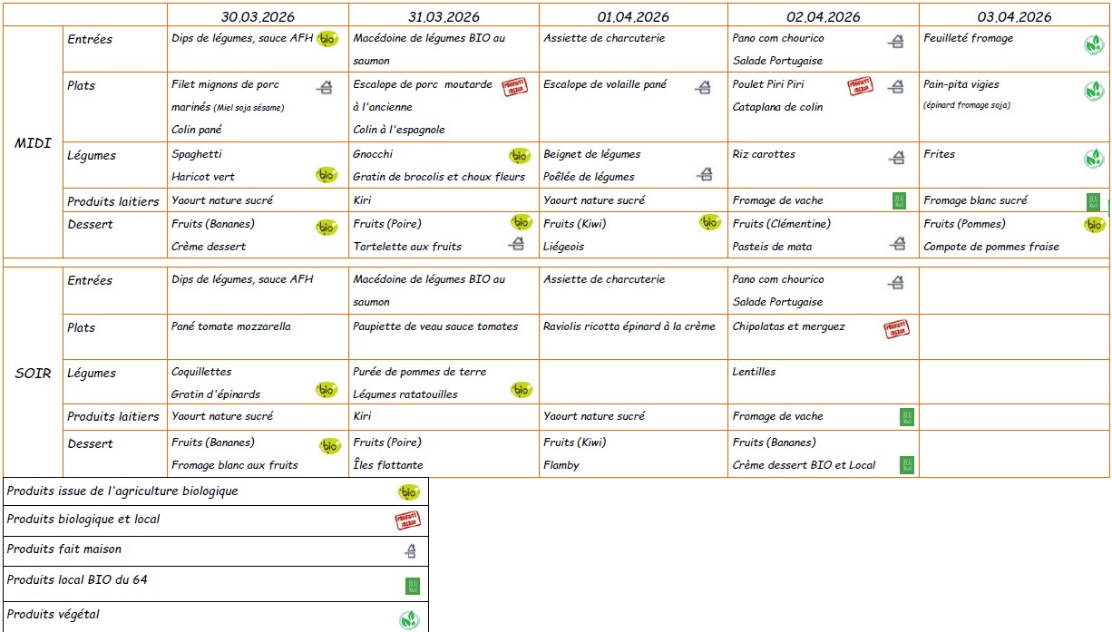 Menu du 30 mars au 3 avril 2026