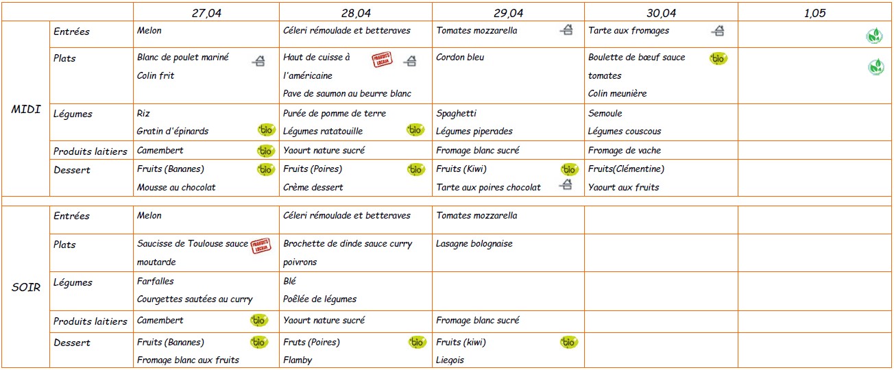 Menu du 27 au 30 avril 2026